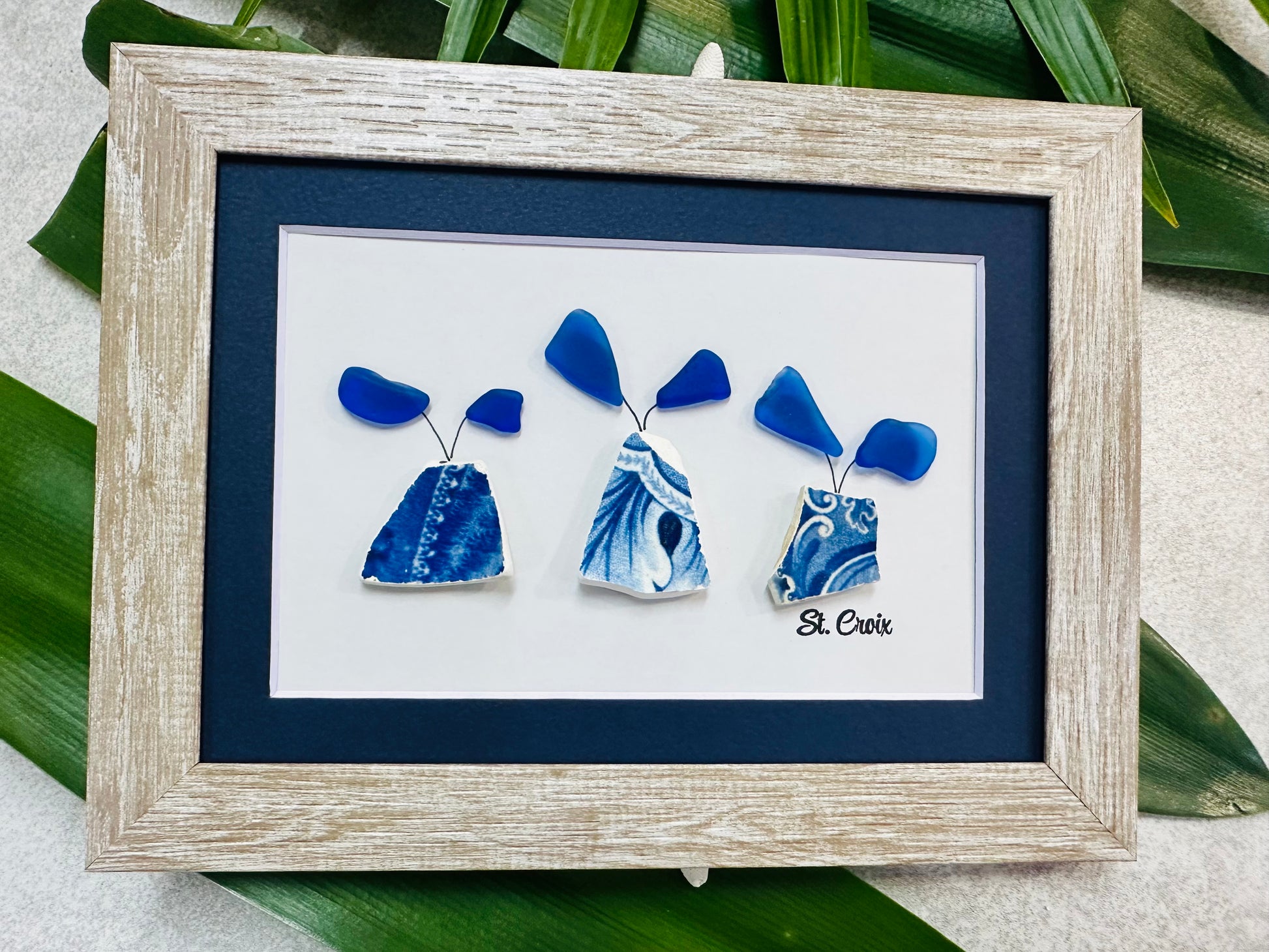 Chaney and Sea Glass Flower Pots Framed art piece with authentic St Croix rare Blue Sea Glass and Blue Chaney. Each one is unique and different and will be similar to the picture shown