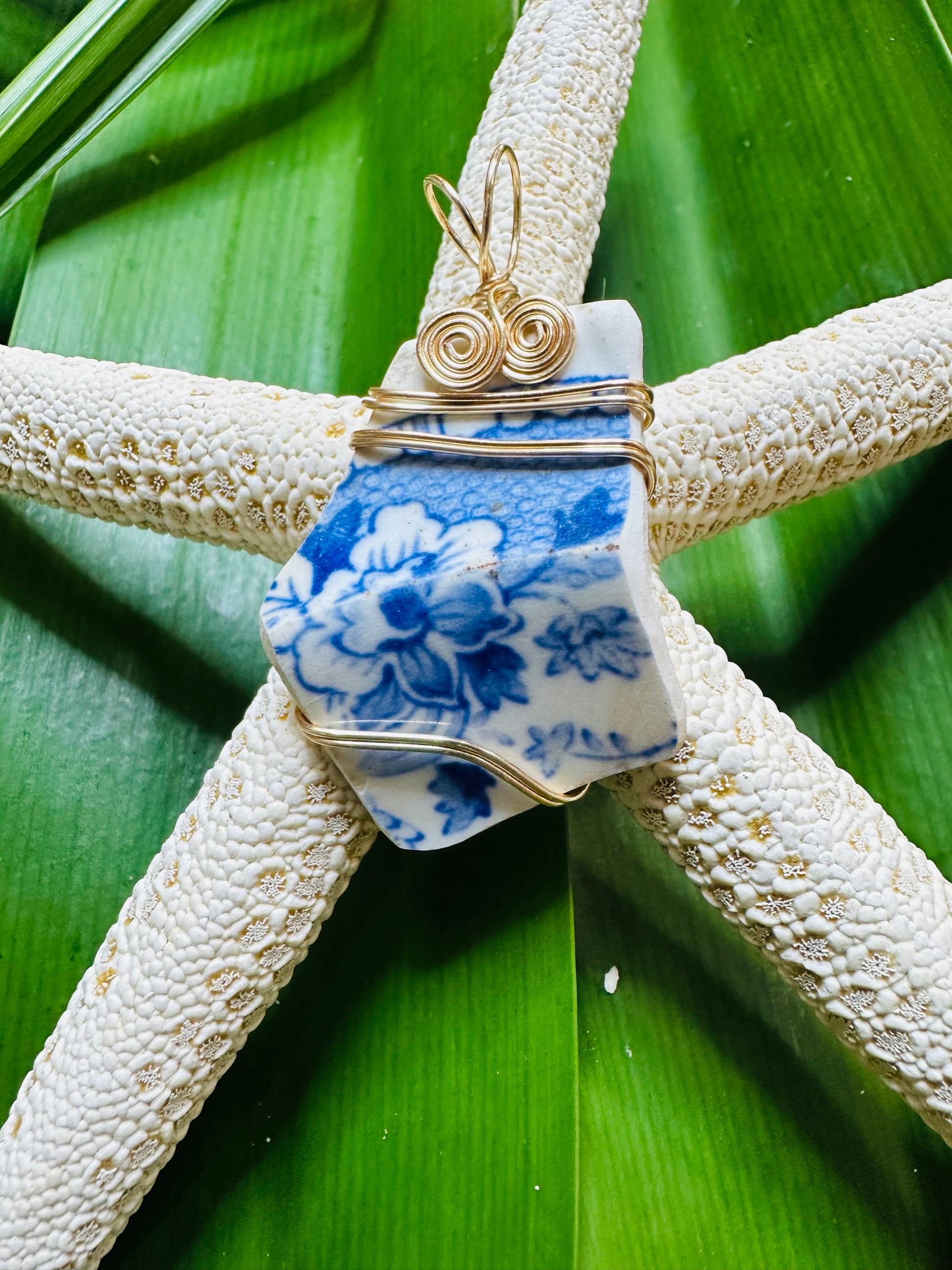 Blue Chaney Pendant wire wrapped in Silver Artistic Wire; Pattern unknown. Pendant measures approximately 1-1/2” x 1-1/4”. 18" adjustable black cord included.
