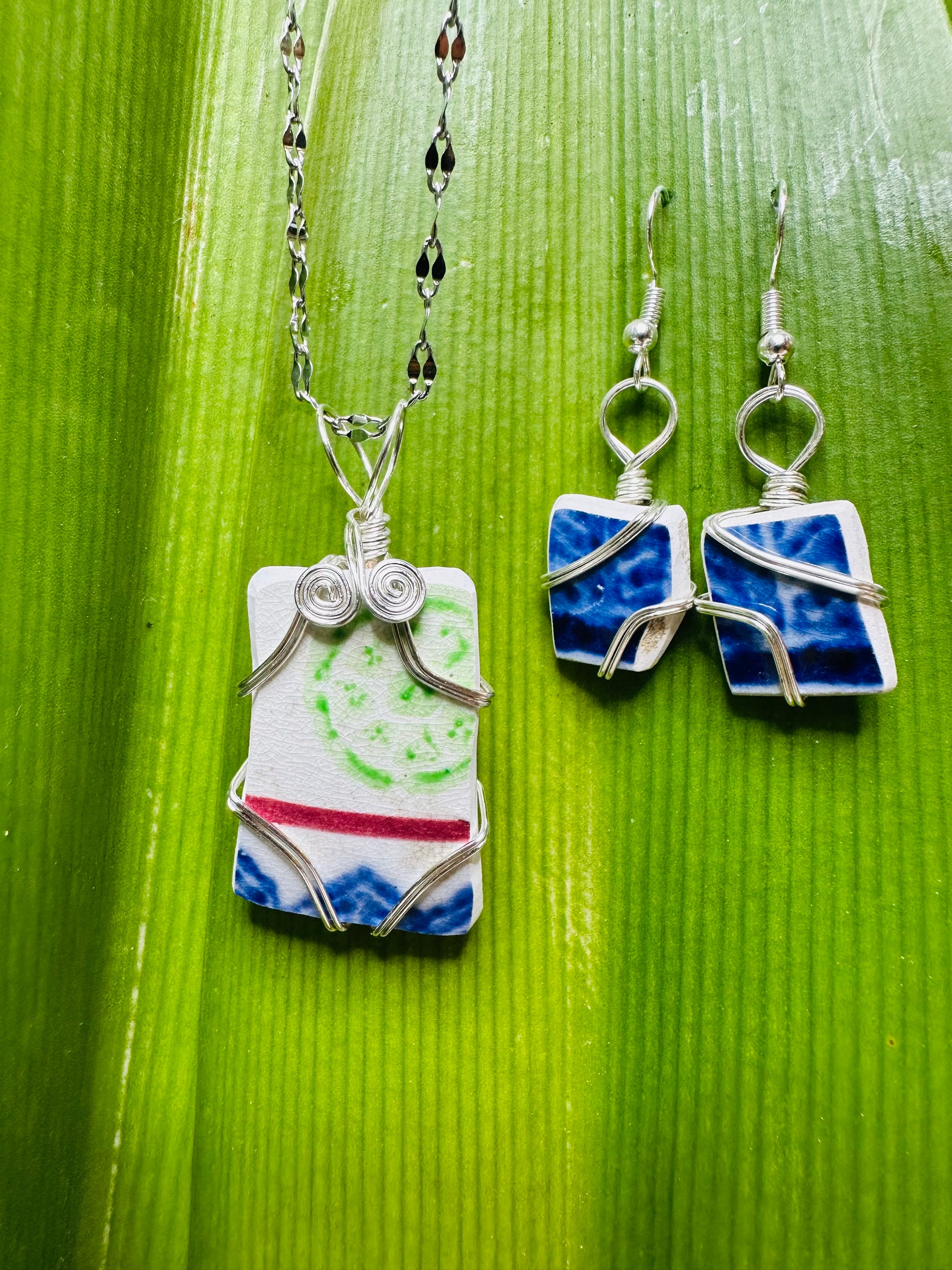 Green, Red and Blue Chaney Pendant and Earrings Set wire wrapped in Silver Artistic Wire. Pendant measures approximately 1-3/4” x 1-1/4”. Chain included with purchase.
