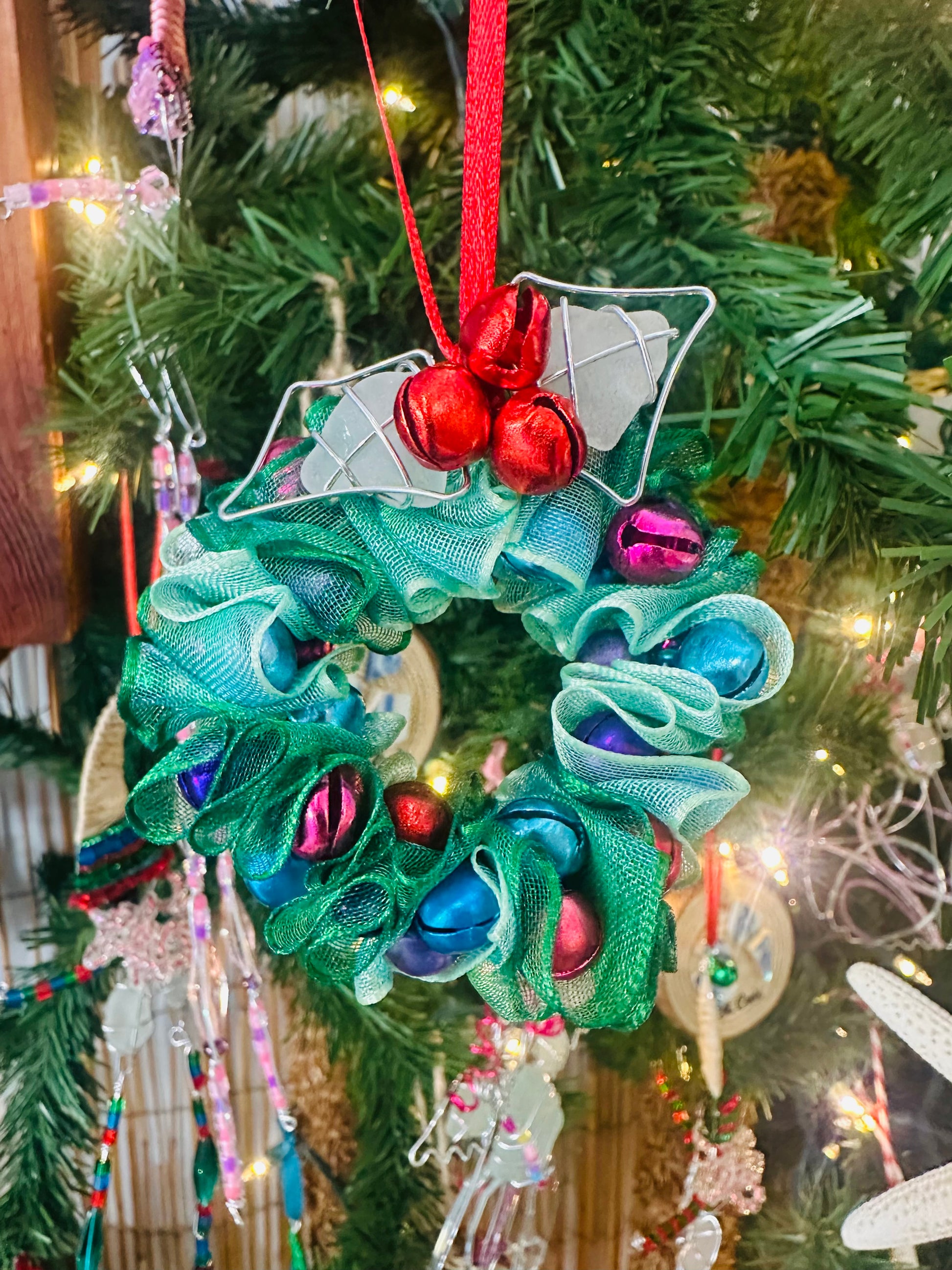 Handmade wire wrapped Sea Glass Christmas Wreath ornament made with authentic St Croix Sea Glass!