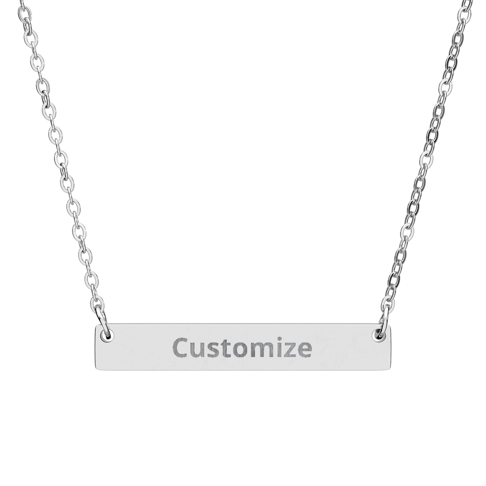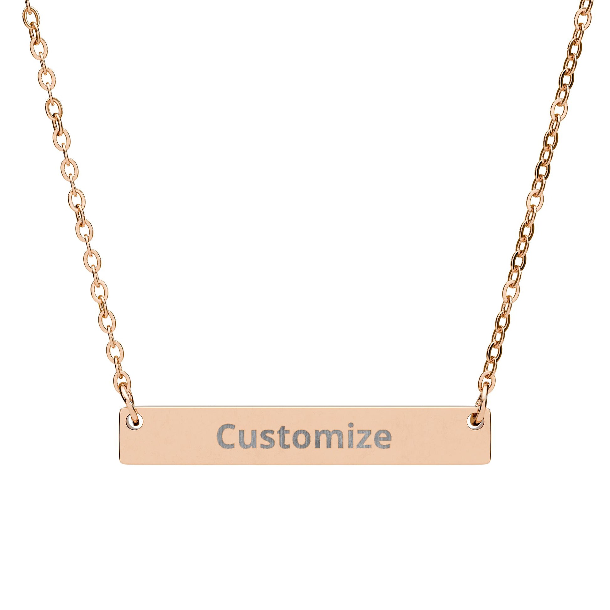 A slender horizontal bar necklace with clean, laser-engraved lettering that carries a quiet confidence. The 32 x 5 mm surgical-grade stainless steel bar sits low on a delicate chain, its permanent etching resisting wear so a name, date, or short word stays crisp over time. Finished in polished silver or sleek black PVD, the piece reads as modern and personal — subtle enough for everyday layering, meaningful enough to mark a memory. Lightweight and hypoallergenic, it slips into a morning routine and stays through travel, meetings, and low-key nights out, always close to the collarbone where small statements feel most intimate.