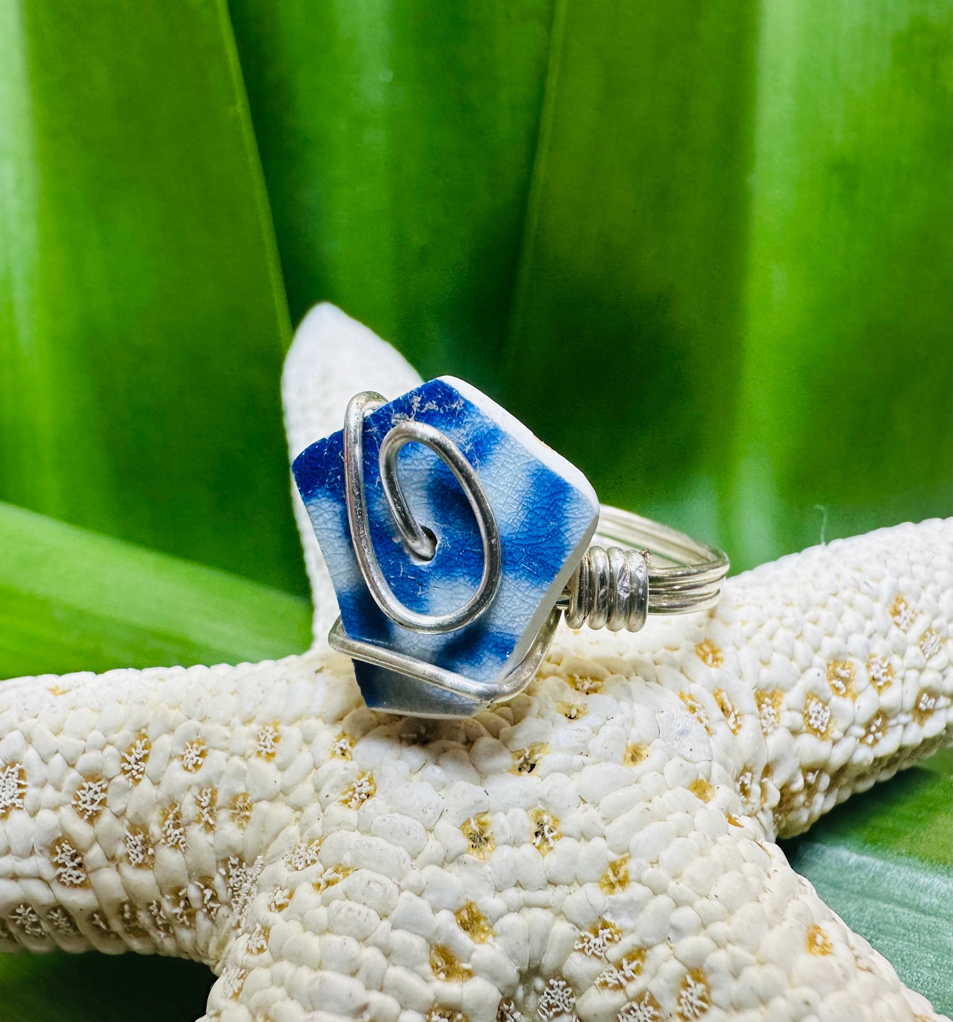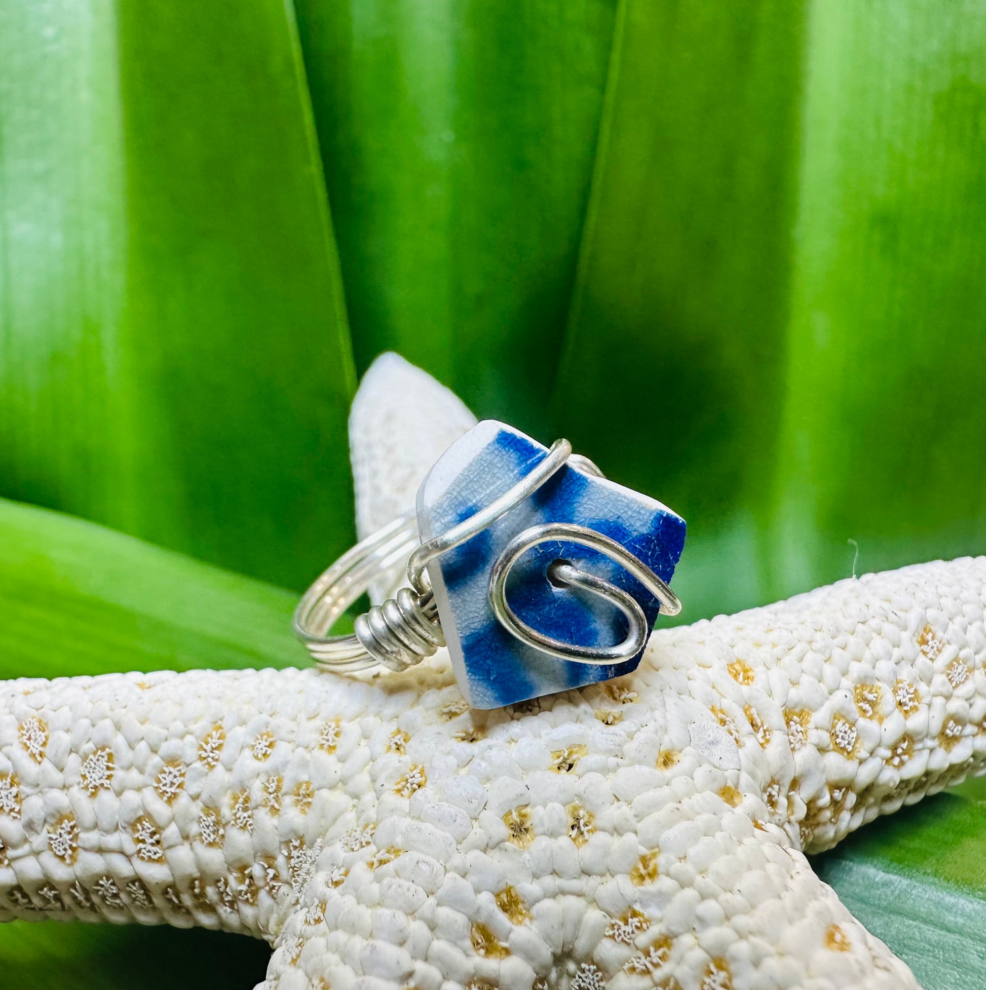 Blue Chaney Ring wire wrapped in Silver Artistic Wire, Size 7.