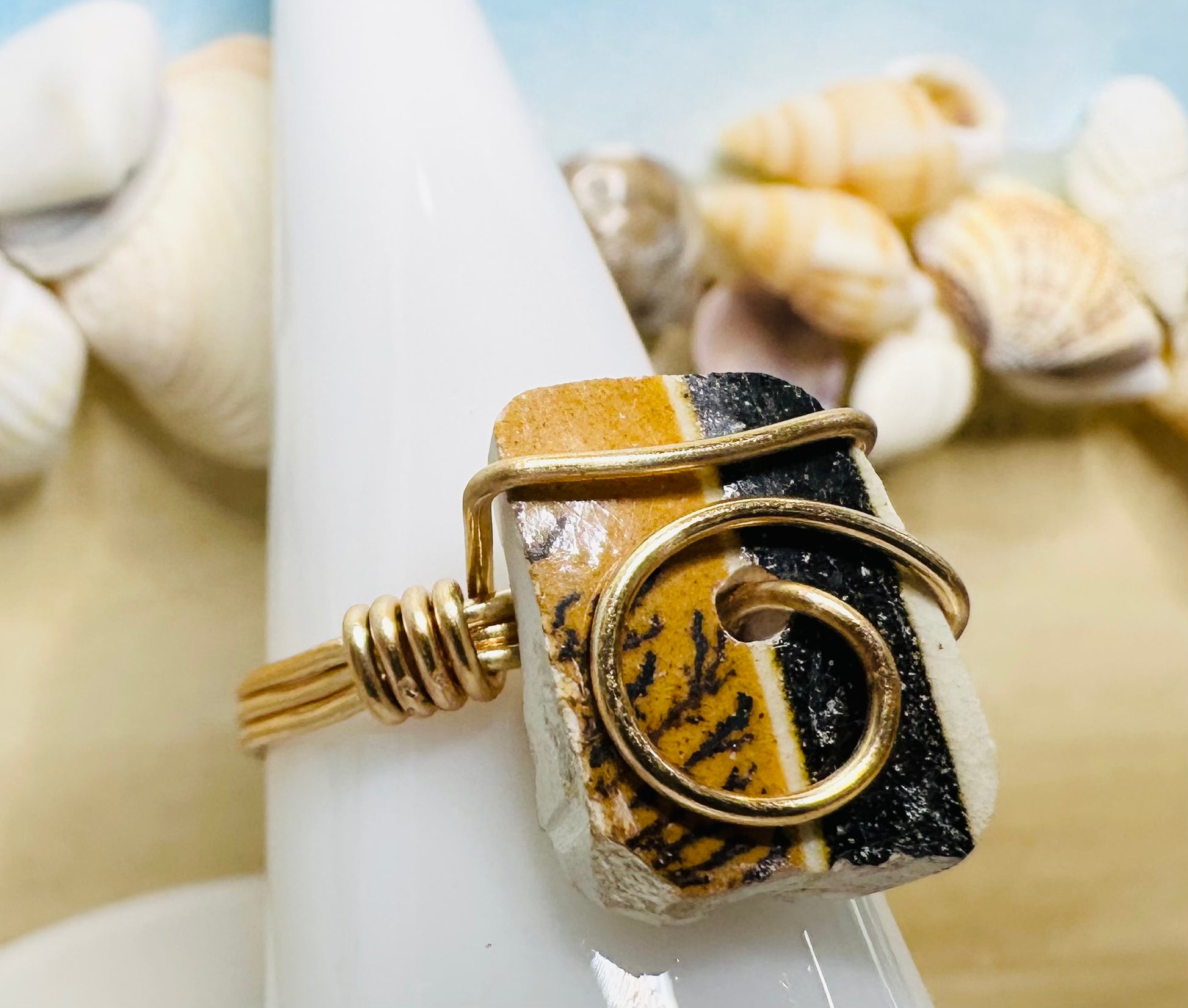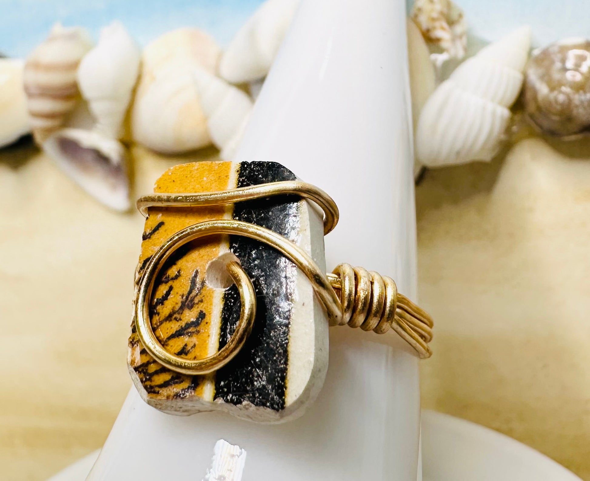 Brown and Black Chaney Ring wire wrapped in Gold Artistic Wire, Size 7.