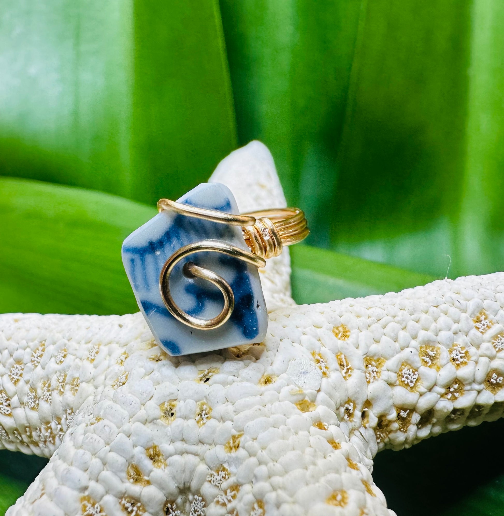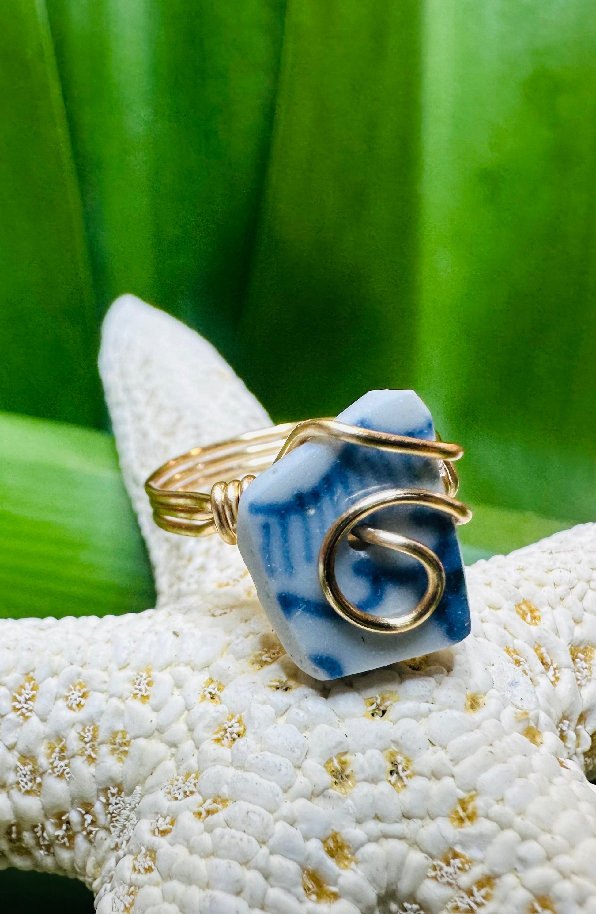 Blue Chaney Ring wire wrapped in Gold Artistic Wire, Size 6.